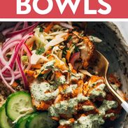 3. Bowl Assembly. Layer your quinoa, crispy chicken, slaw, cucumbers, pickled red onions, and then don’t be shy with that mint sauce over the top!