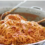 - Combine the noodles and the sauce in a large pot or mixing bowl. Top with grated cheese. At Cherne they grate a processed cheese similar to Velveeta and let it melt into the top layer of the spaghetti.