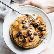 With peanut butter and chocolate chips and a little bit of maple syrup, which is just how I ate them growing up, post-swim-team practice, sometimes mushed together into a big pile of “scrambled pancakes” because me and my teenage squad didn’t know what we were even doing with a pan and a spatula, but we knew we needed those chocolate-kissed carbs in our systems immediately, stat, SOS, even if it meant squished together into pan remnants topped with sprinkles and chocolate chips and syrup.