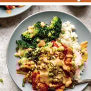 My husband and I enjoyed this one! It packs a good amount of flavor. Commenting to share that we cut out quite a bit of sugar from this recipe and it tastes great. We halved the cornstarch, kept just a quarter of the brown sugar to help with sauce caramelization, and completely cut the maple syrup. A couple other notes – we don’t have a blender so we used a food processor for the cashew sauce and it worked just fine. We had extra cashews so we tossed some extra whole cashews into the chicken/curry sauce mix at the end and they add a nice extra crunch.