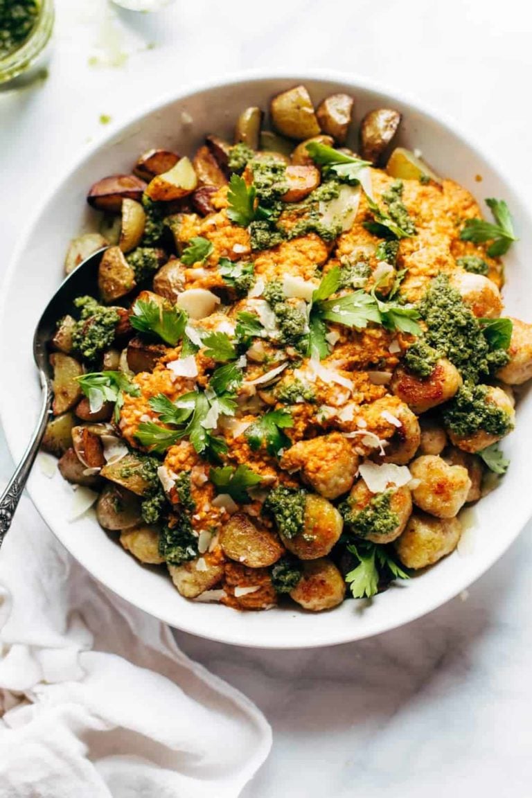 This super easy recipe is made with chicken, breadcrumbs, Parm, garlic, eggs, salt. Served with crispy potatoes and a 5-minute Romesco sauce!
